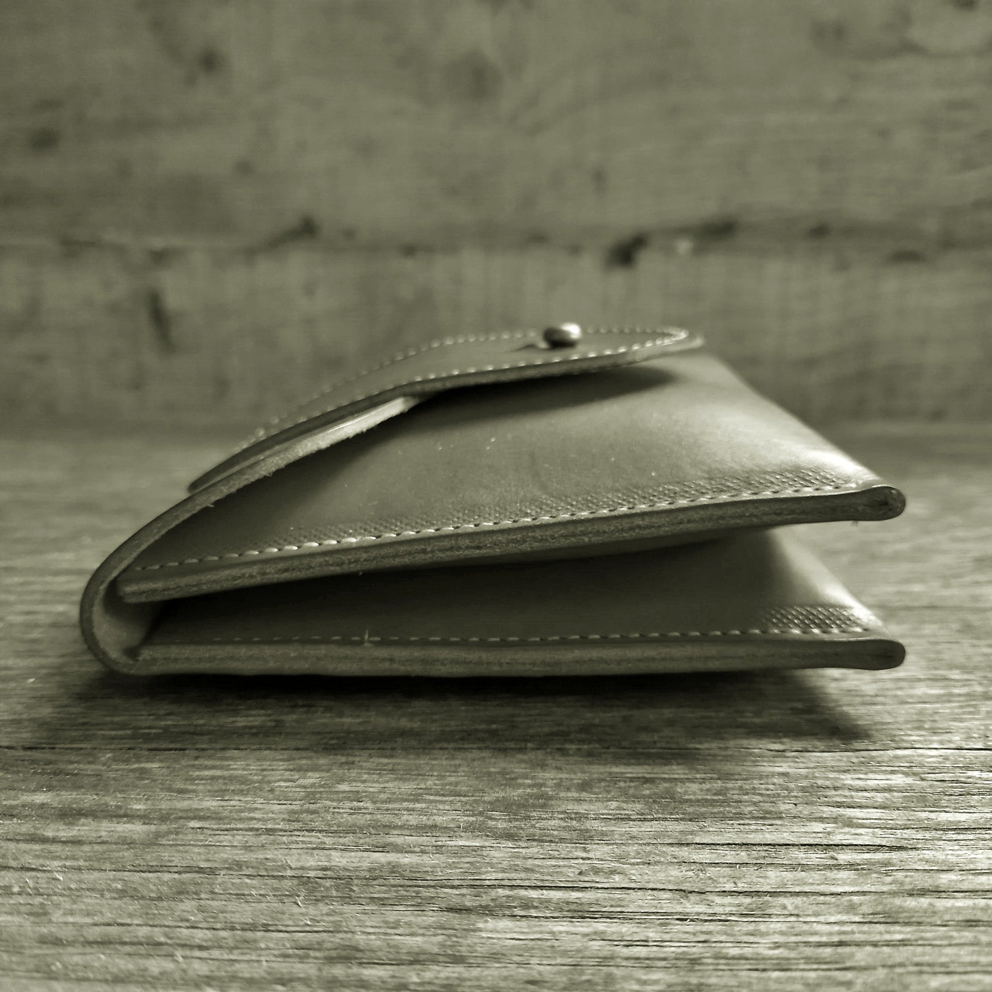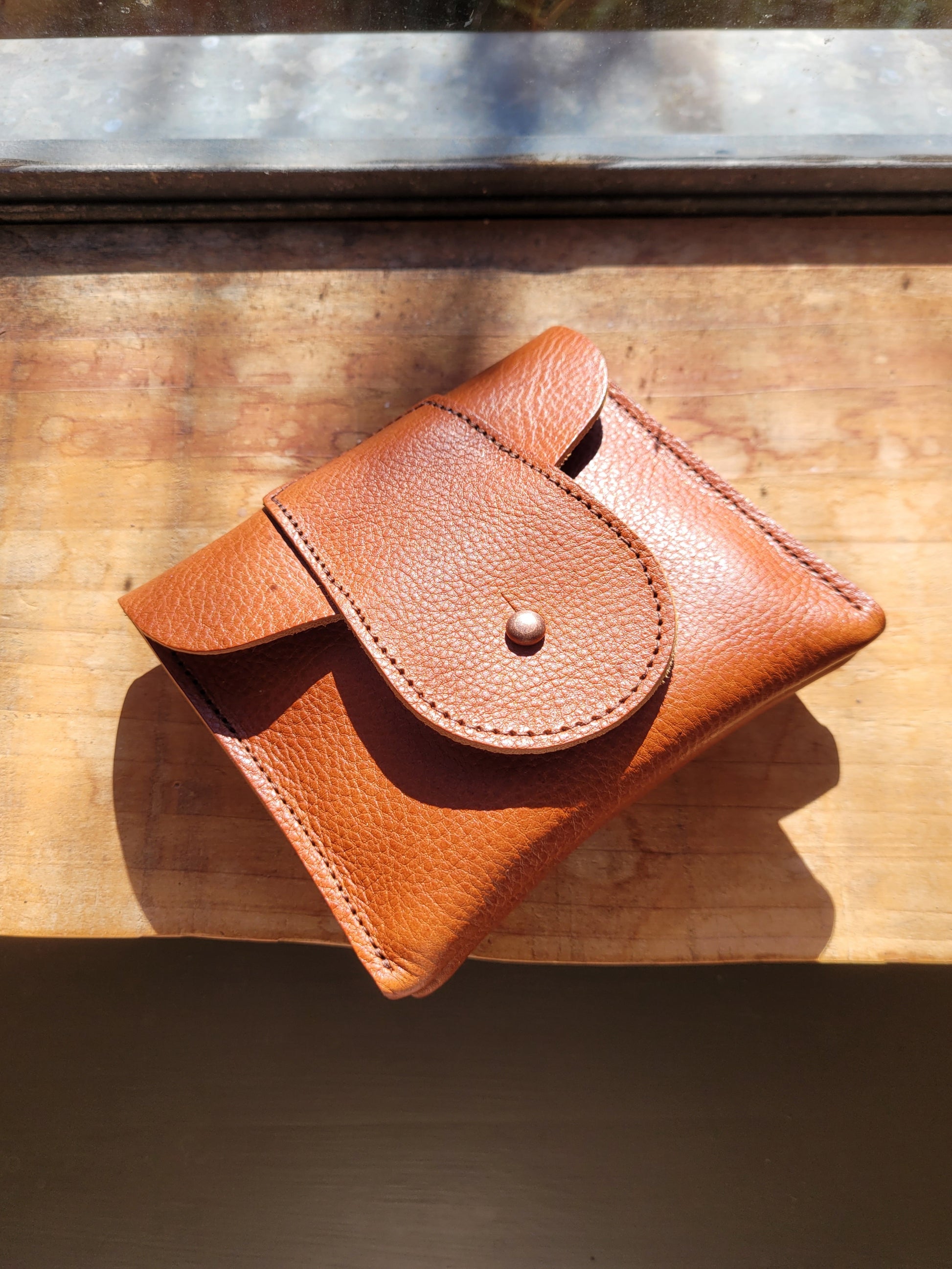 The Pocket purse is roomy and practical. Triple compartments for organising your bits and bobs. Two large ones, front and back, with a smaller middle one for cards, stamps or an emergency fiver. Simple stud closure.